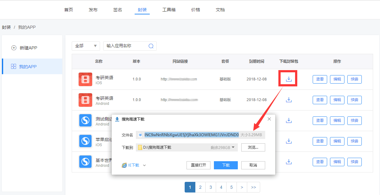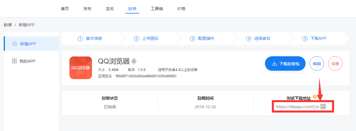 在【封装-APP详情页】如下图所示:点击测试下载链接,进行测试安装。